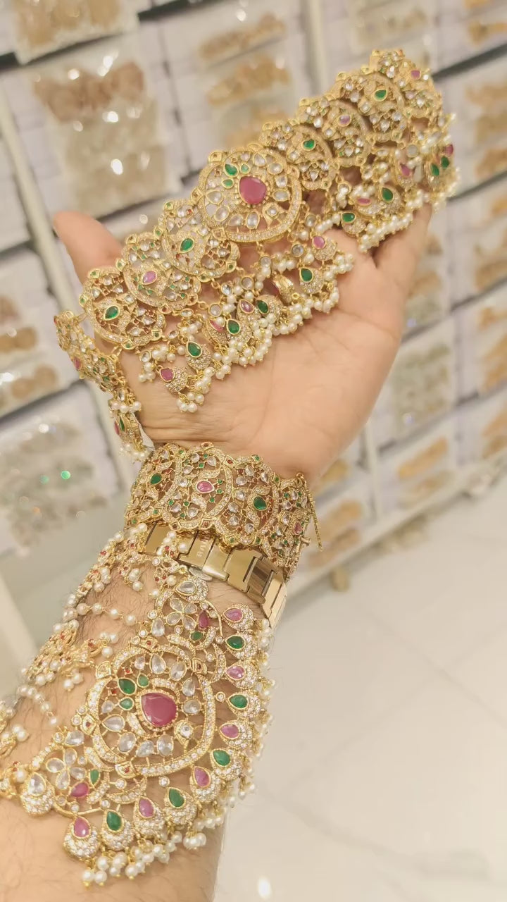 set includes necklace+long necklace+earrings+tikka+jhoomar/passa+pair of bangles+ring+nath